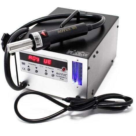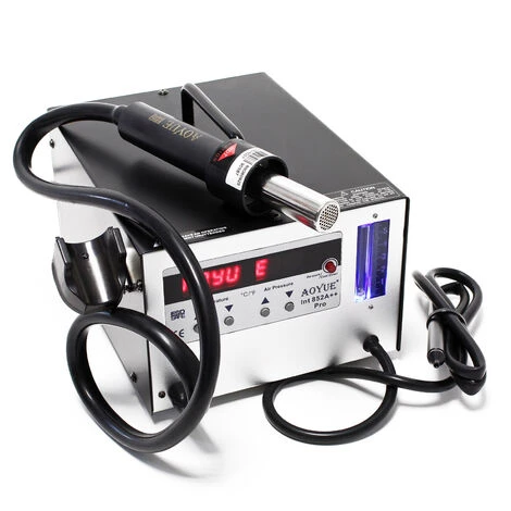 La station de soudage idéale. L’appareil pour tout laboratoire ou atelier. Il s’agit d’une station à air chaud haute technologie pour réparation de CMS du fabricant Aoyue. Le modèle 852A++ est particulièrement bien maniable et facile à l’emploi! La température est affichée sur un écran numérique. L’appareil se met en état de veille dès que la poignée est posée et l’appareil se refroidit, ce qui permet d’économiser les frais d’énergie et de prolonger sa durée de vie. L’air et la température peuvent être rectifiés et ajustés sur l’écran par touches pression . Le flux d’air est visualisé par un débitmètre à billes. Le corps est peint en noir et muni d’un support pratique dans lequel on peut mettre le stylo souffleur d’air chaud. De plus il a une poignée et est facile à transporter. Tout débutant peut se servir de la station en quelques minutes! Vous recevrez à l’achat de cet appareil quatre buses différentes, un stylo Vaccum Pen Aoyue 939 (avec pointes de rechange) pour que vous puissiez continuer de travailler SANS coûts supplémentaires.