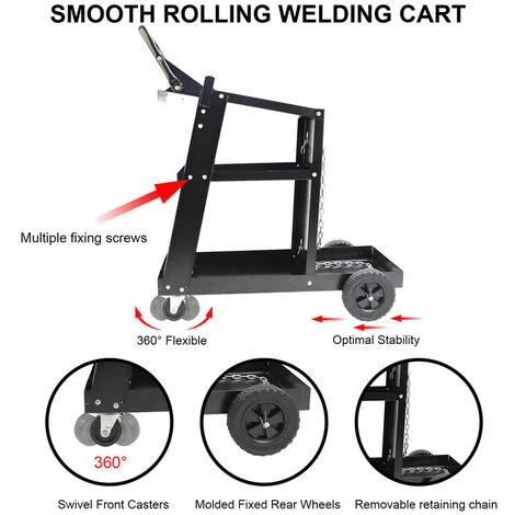 Le chariot d’atelier de machine à souder est composé d’acier robuste et de vis en acier inoxydable robustes; Dimensions totales : 76 x 30 x 85 cm (L x l x H) ; charge maximale de 90 kg