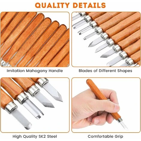 Le bois est utilisé pour travailler avec ces outils de sculpture. La netteté des bords est très importante. L’emballage est livré avec des meules, ce qui facilite l’affûtage des outils de sculpture sur bois.