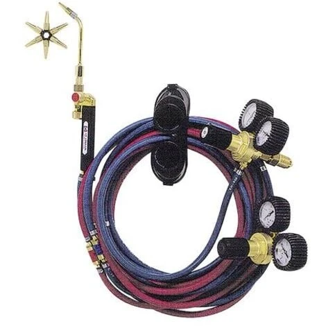 Equipement complet montĂ© comprenant : – 1 chalumeau soudeur lance rigide, – 1 clĂ© et 7 becs de 40 Ă 400 litres, – 1 mano-dĂ©tendeur pour acĂ©thylĂšne, – 1 mano-dĂ©tendeur pour oxygĂšne, – 1 paire de clapets anti-retour pare-flamme, – 5 mĂštres de tuyau diam 6,3 en caoutchouc, – 1 paire de lunette soudeur. – PrĂȘt Ă l’emploi direct sur bouteille.