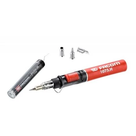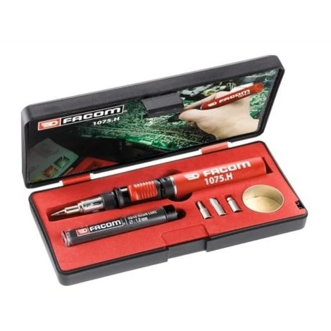 Composition : 1 fer à souder, 4 pannes (pointe conique 1 mm, ciseau 2,4 mm, couteau chaud, soufflante de chaleur), 1 distributeur de soudure.