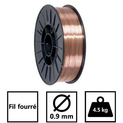 Bobine de fil fourré acier de 0.9mm de diamètre Idéal pour le soudage sans gaz mince carbone et aciers au carbone-manganèse. Ce fil est conçu pour être utilisé dans toutes les positions de soudure et protège de l’oxydation le bain de fusion. poids de la bobine 4.5kg. bobine diam 200 mm