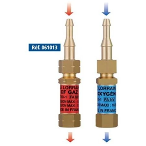 Paire de clapets Anti-Retour Pare Flamme CF filetés 16x150mm D/G pour montage sur chalumeau à raccord fileté. Norme EN 730-1. OX/GAZ avec écrous et olives étagées Ø 6,3 et 10 mm Adaptés au gaz Oxygène pour le bleu et acétylène pour le rouge en soudure au chalumeau oxy acétylénique.