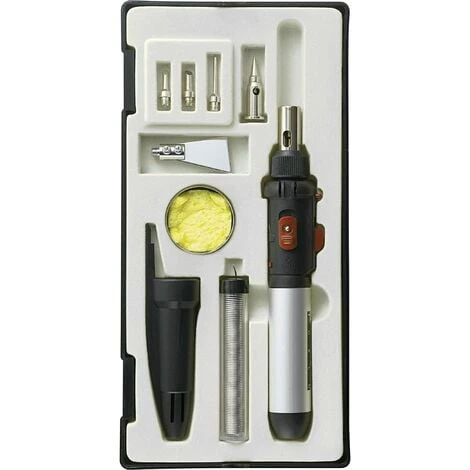Combinaison universelle fer à souder/chalumeau à gaz au design ergonomique. Avec allumage piézo Pour travaux de soudure ou de chauffe de matériaux (ex.: gaines thermorétractables) indépendamment du secteur.